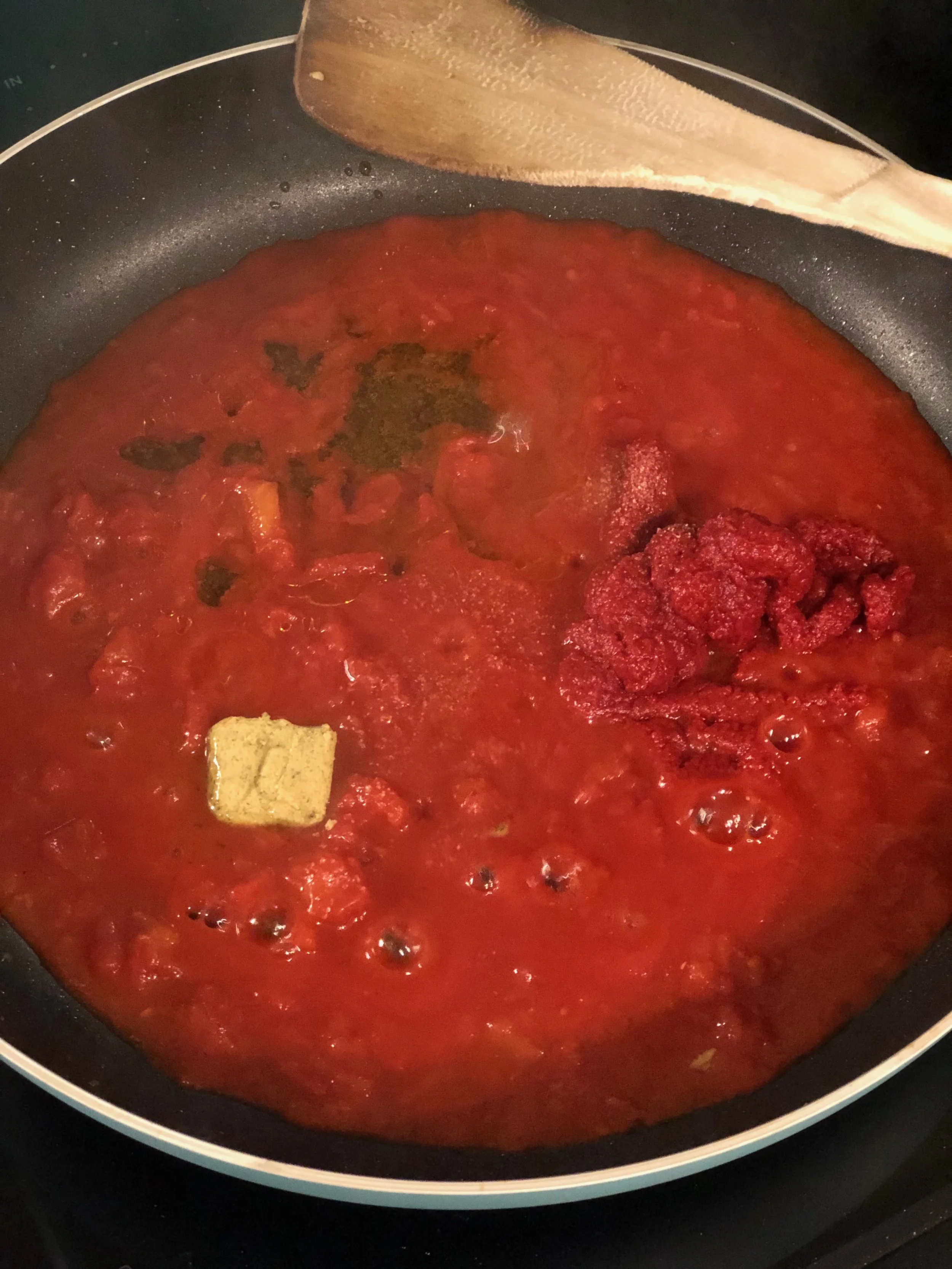 When the tomato is reduced down so that the flavours are super intense, then you’re good to go. The sweet potatoes should be firm enough that they would not be able to make a mash, but soft enough so that when they cook you don’t bite into a slice and there’s a part that’s total. They’re the easiest parts done, should take about twenty minutes of watching.